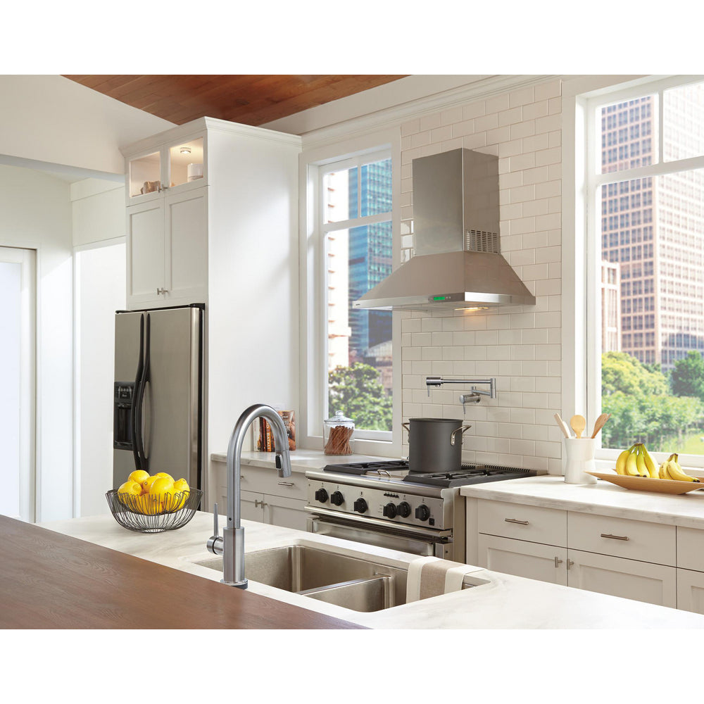 The Delta Contemporary Pot Filler is designed for convenience and efficiency, making it easy to fill large pots directly on the stove. With dual swing joints and dual shut-off valves, it offers flexible positioning and precise control. Its strong 4.3 GPM flow rate allows for quick fills, while the wall-mounted design saves space and adds functionality to your kitchen.