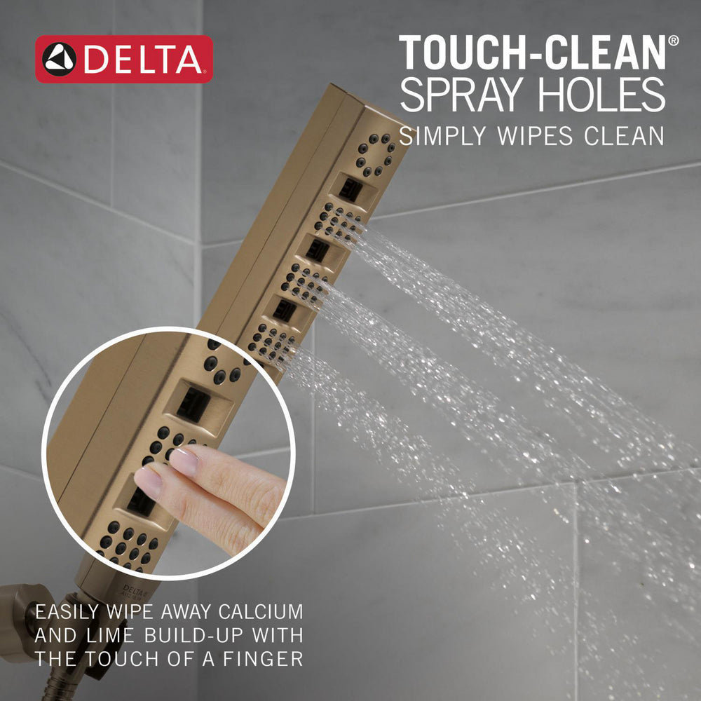 Experience a better shower with the control and flexibility of a Delta hand shower. Great for showering yourself or your loved ones and pets, as well as for keeping your shower and tub clean. Delta H2Okinetic Showers look different because they are different. Using advanced technology, H2Okinetic showers sculpt water into a unique wave pattern, giving you 3X the coverage of a standard shower head.* The end result is a shower that provides more coverage, more warmth and more intensity for a truly drenching shower experience. So go ahead and indulge, because now you can enjoy the feeling of more water without using more water. The Matte Black finish makes a statement in your space, cultivating a sophisticated air and coordinating flawlessly with most other fixtures and accents. With bright tones, Matte Black is undeniably modern with a strong contrast, but it can complement traditional or transitional spaces just as well when paired against warm neutrals for a rustic feel akin to cast iron. While other products may gather unsightly mineral build-up over time, Delta soft rubber Touch-Clean spray holes allow any mineral residue to simply be wiped away for an instantly refreshed look ' with no need for soaking or the aid of chemical cleaners. The pause setting gives you ample space for shaving, lathering and other shower tasks, then easily restarts the water with the temperature where you left off. This spray setting helps you conserve water, so you can worry less about depleting your supply of hot water - and you help the environment too. *Coverage measured in accordance with EPA WaterSense Specification for shower heads, March 4, 2010.