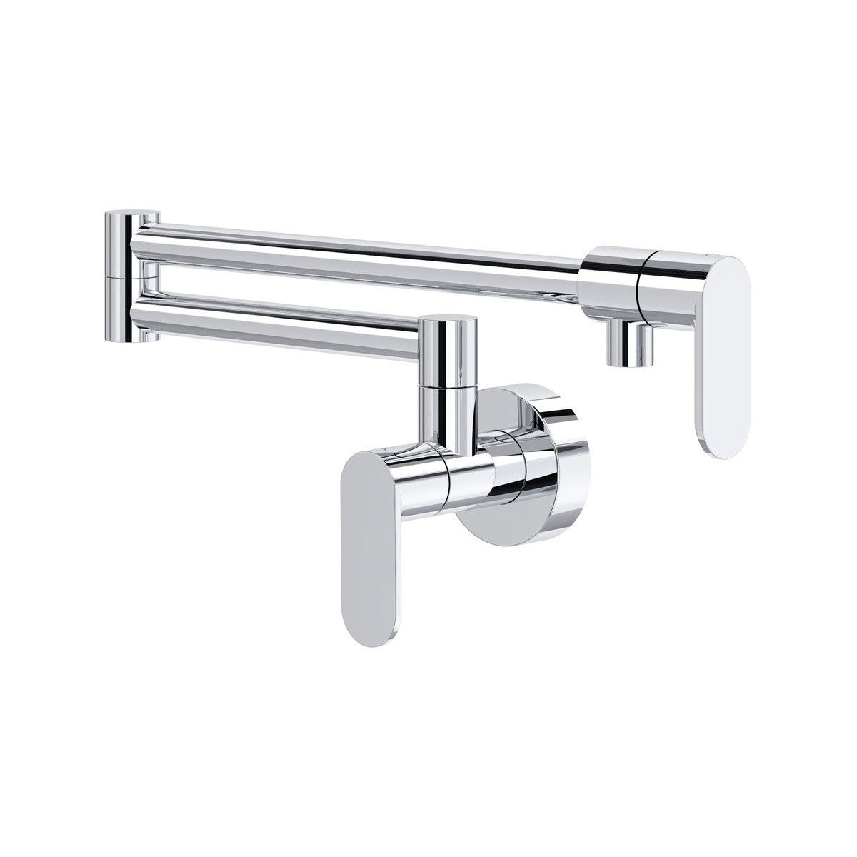 Wall-mounted pot filler designed to make filling large cookware easier and safer directly at the stove.