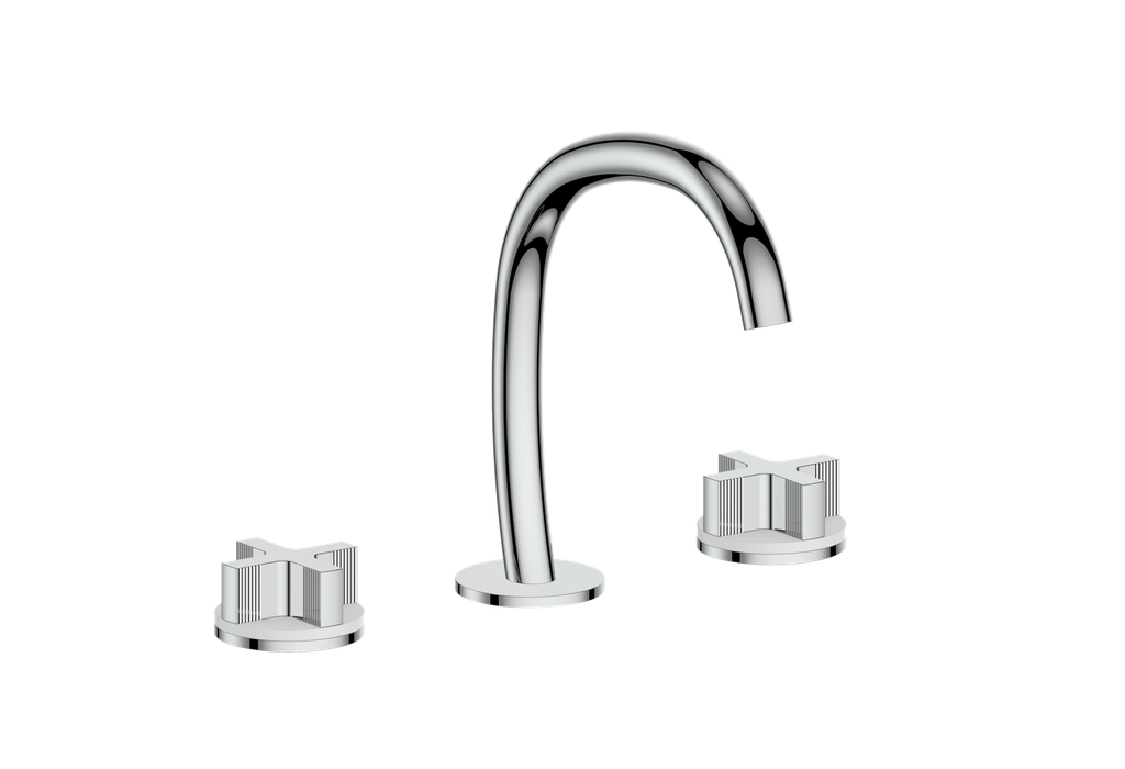 Elegant 8" C.C lavatory faucet with Cross handle, featuring fluted detailing and a pop-up drain. Designed for both style and performance, it offers an adjustable aerator and durable ceramic cartridges.